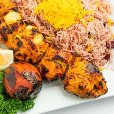 Flat strips of boneless chicken breast marinated and charbroiled. Served with basmati rice, topped with saffron and a charbroiled tomato.